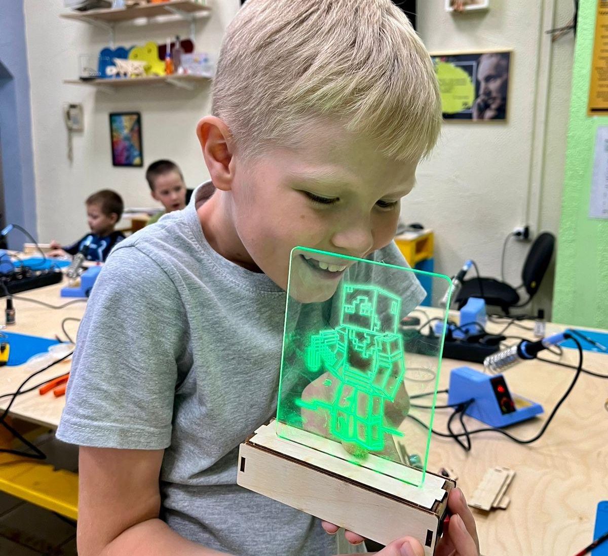 Все наши ученики получать комплект деталей, вырезанных на лазерном станке. Следуя инструкциям наставника, ребята соберут светильник, установят комплект батареек и присоединят светодиод. Также научаться работать с проводами и узнают основы электроники.